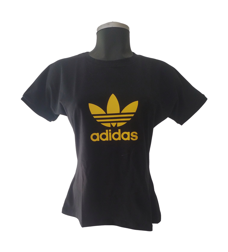 Blusa mujer, negra, mangas cortas: Imagen. Adidas amarillo. Efecto coordinado de una buena marca y la delicadeza del producto. Material: Algodón. Talla M.