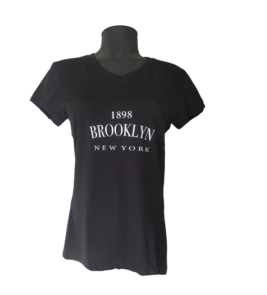 Camiseta negra, mujer, mangas cortas: Descripción : Fecha de construcción del puente de Brooklyn y localización. Estampada en vinilo blanco. Cuello en V. Talla L
