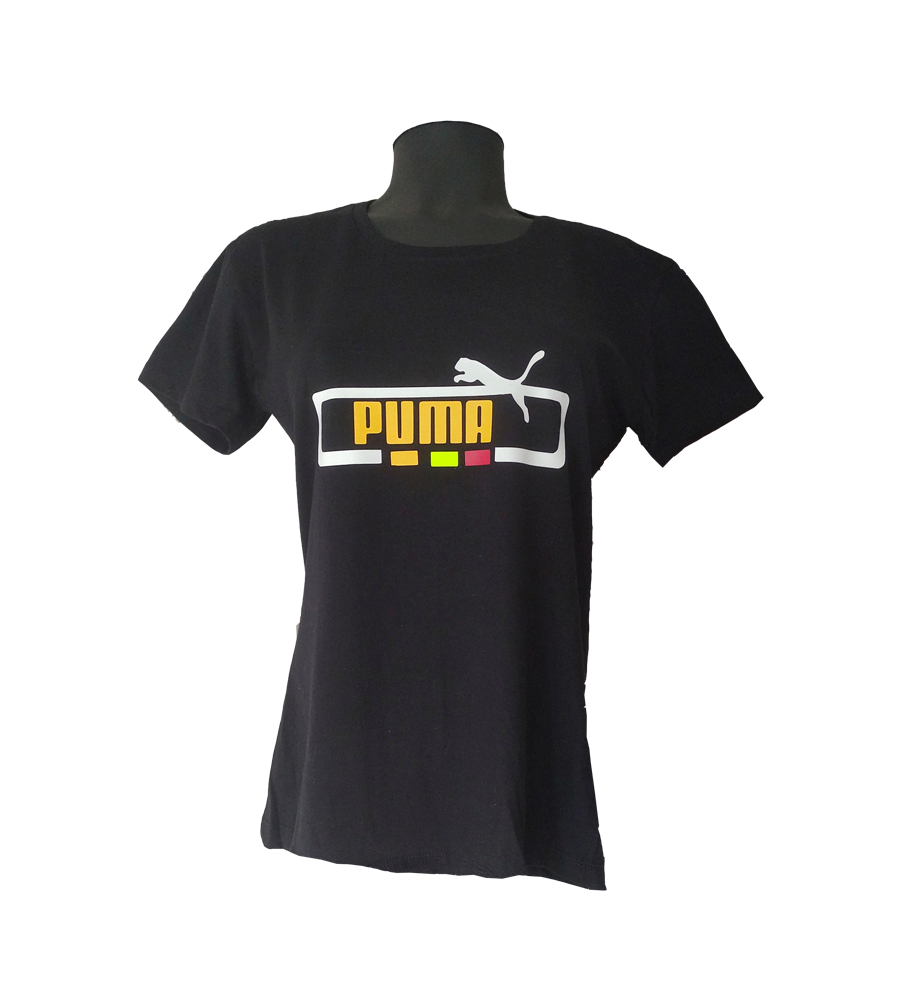 Camiseta negra, mujer, mangas cortas: Imagen : Puma blanco Saltando, Nombre amarillo. Estampada en vinilo blanco, amarillo, rojo, verde. Cuello redondo. Talla L.