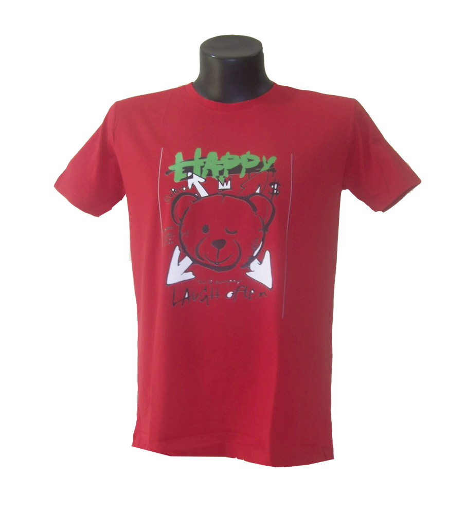 Camiseta hombre, roja, mangas cortas, algodón, estampada DTF: Imagen: Oso Happy verde que invita a sonreír cada día. Talla L