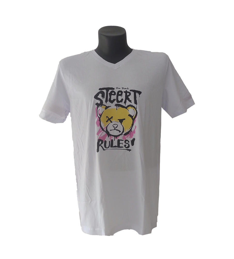 Camiseta hombre, blanca, mangas cortas, algodón, estampada DTF. Imagen: Oso the back steert rules. Talla XL.